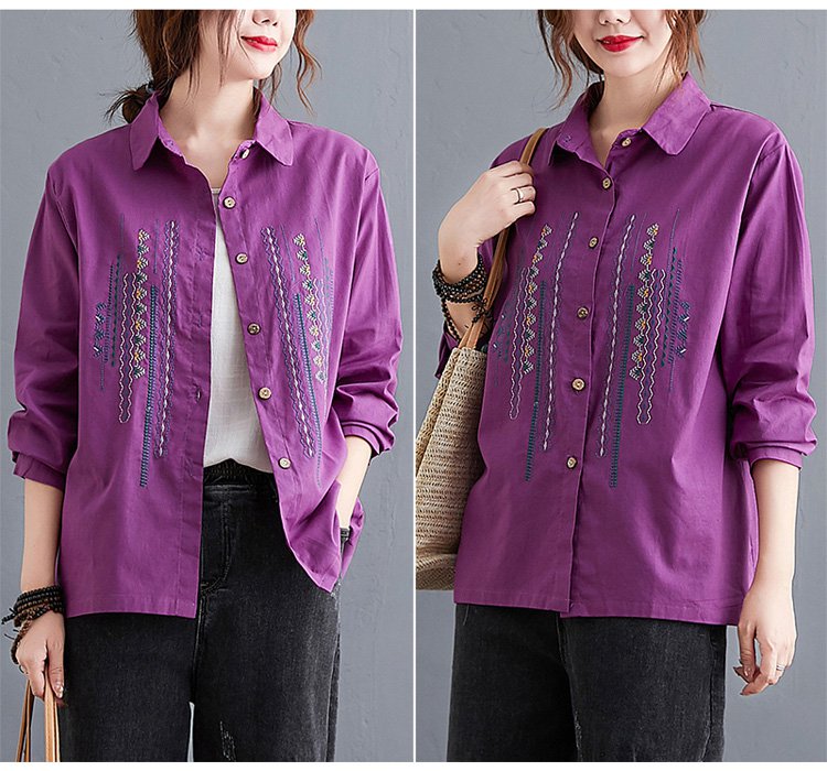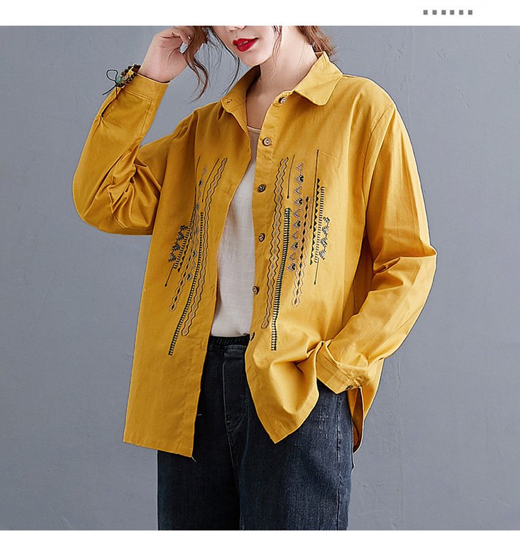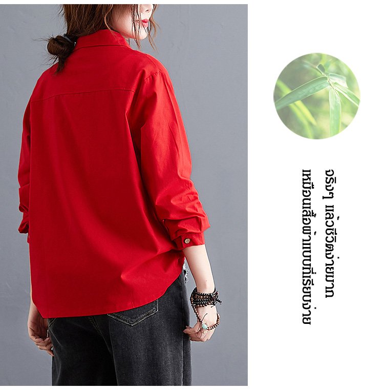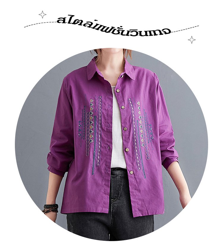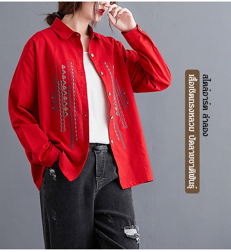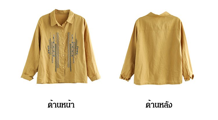 เสื้อเชิ็ตแขนยาว คอพับ ผ้าคอตตอนลินินปัดลาย ทรงหลวม