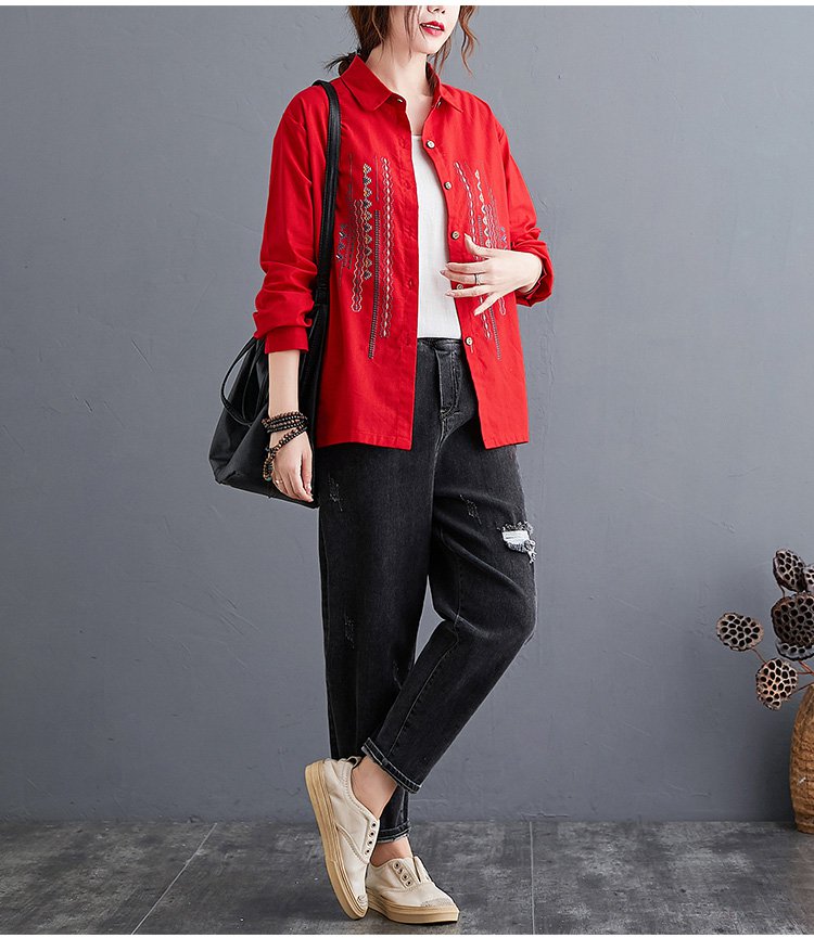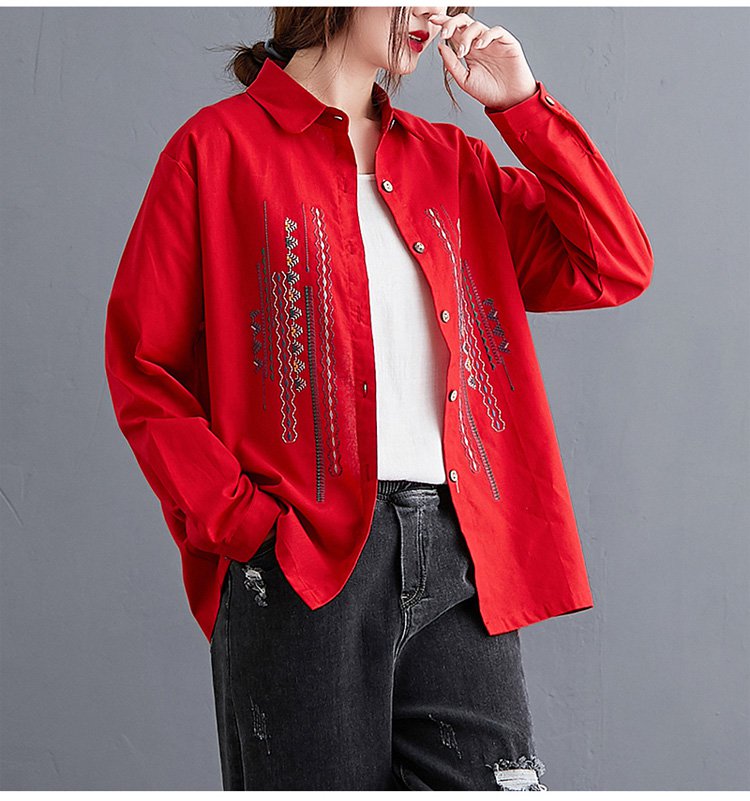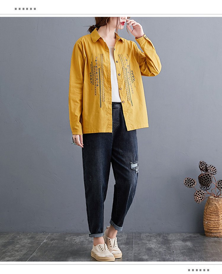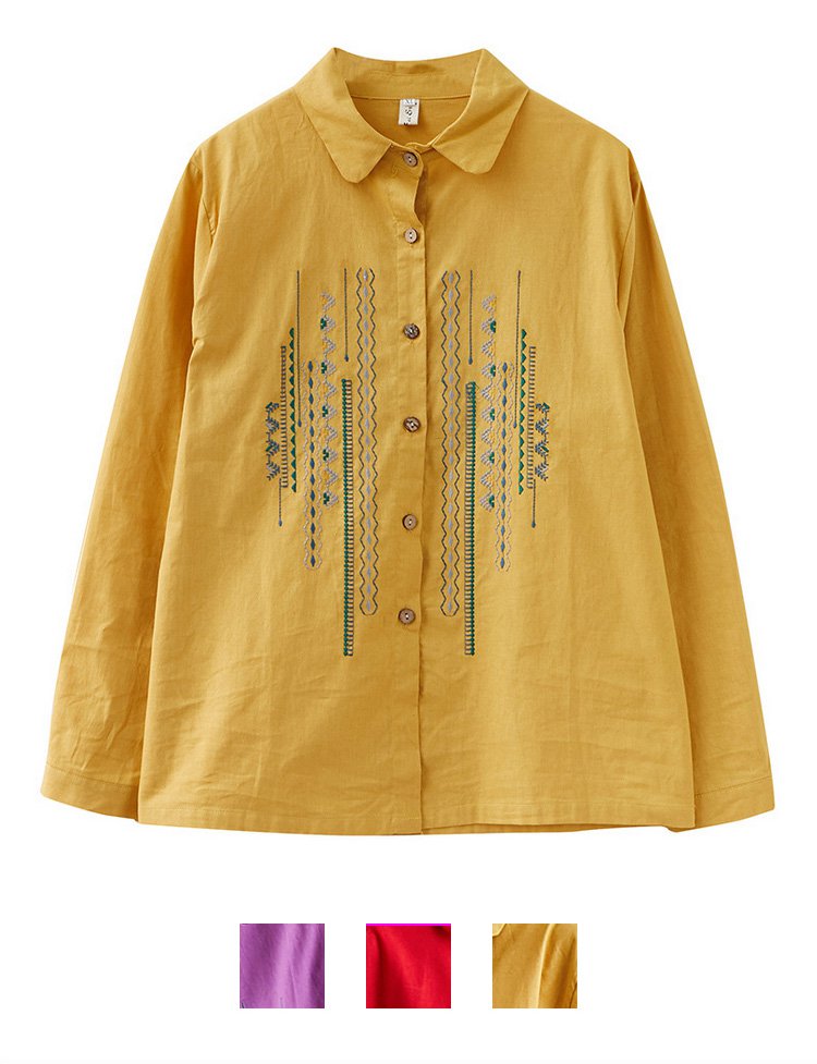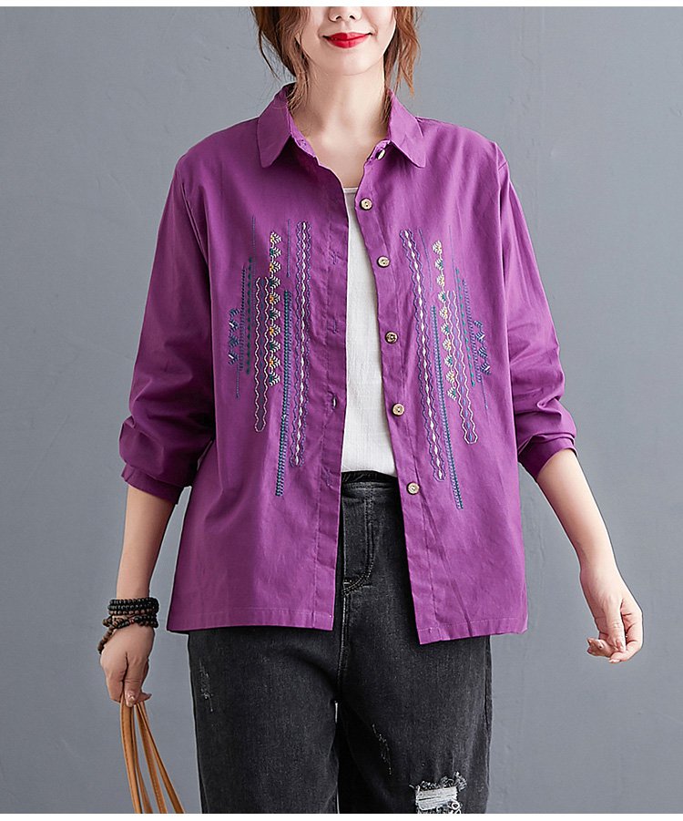 เสื้อเชิ็ตแขนยาว คอพับ ผ้าคอตตอนลินินปัดลาย ทรงหลวม